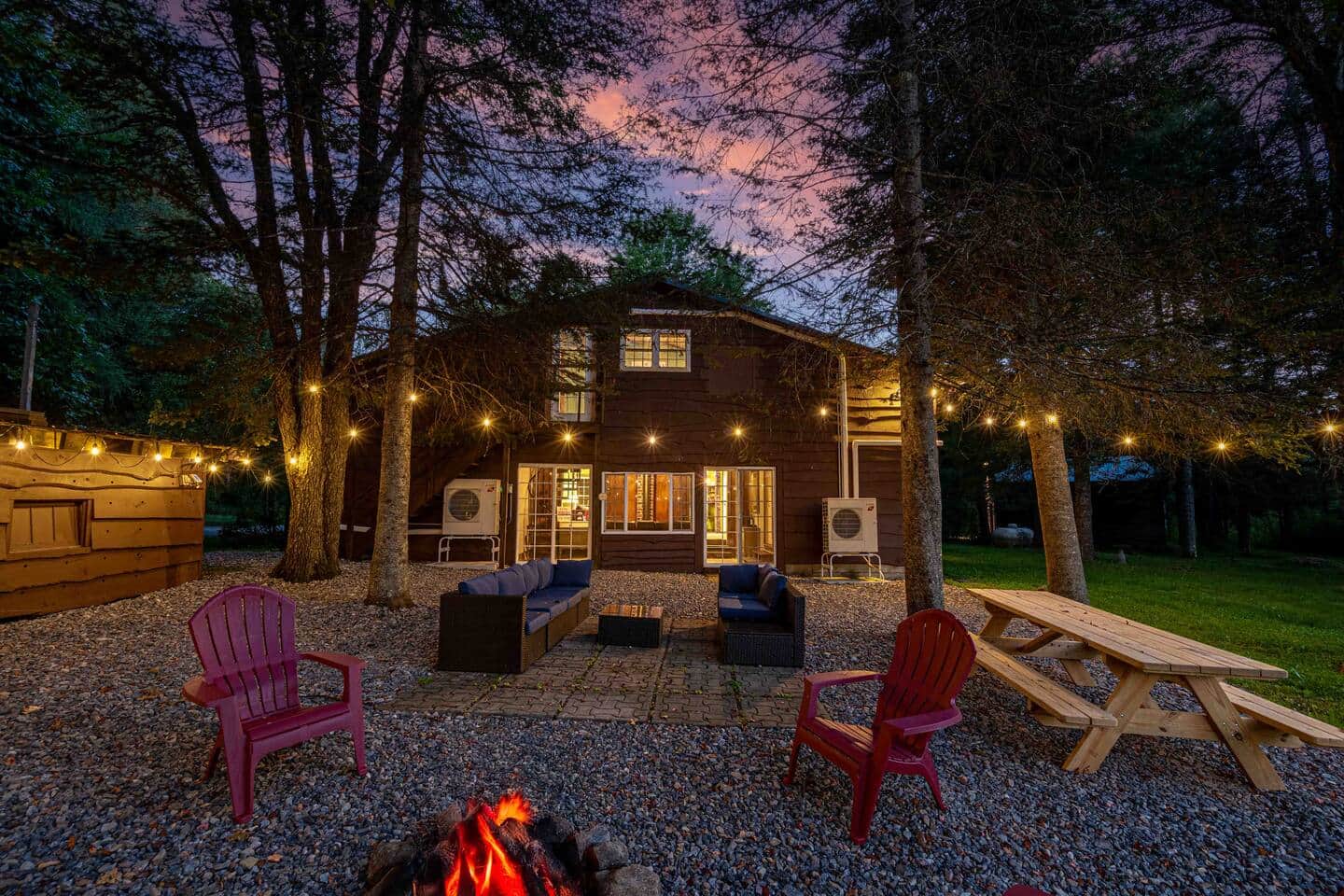 Back area with picnic table, firepit, and outdoor couch